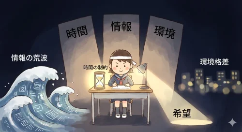 しかし、当時はその中から本当に必要な情報を見つけ出すのは至難の業であり、検索に時間を取られ、勉強時間が削られていく。 - 環境による格差:都市部には予備校があり、仲間もいる。