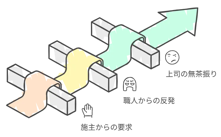 施主からは「出来るよね?」と詰められ、職人からは「そんな話は聞いていない」と反発される。