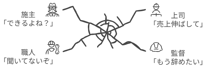• 施主や協力業者との利害対立に、折り合いがつかない。