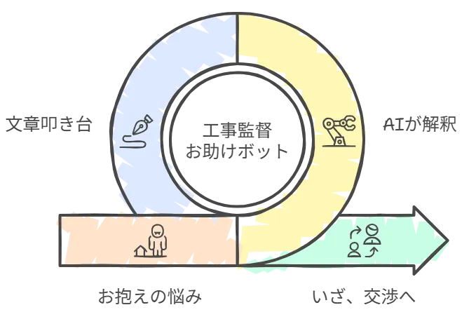 誰にも言えない「施主のわがまま」と「職人の身勝手」を思い切り吐き出させ、AIが現場監督のプロとしてその苦労を全肯定し、最後にはクスッと笑える「現場あるある」で締める。